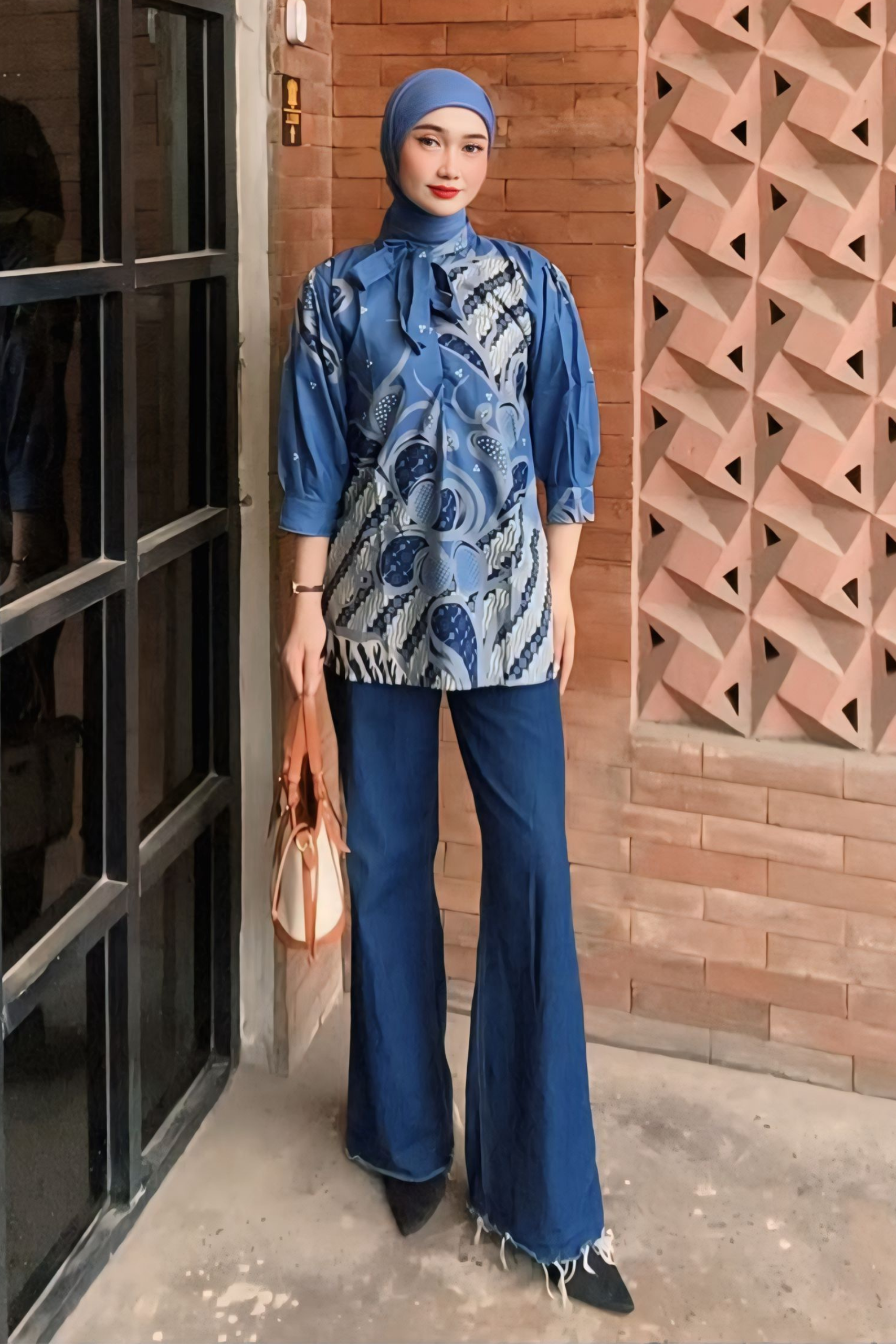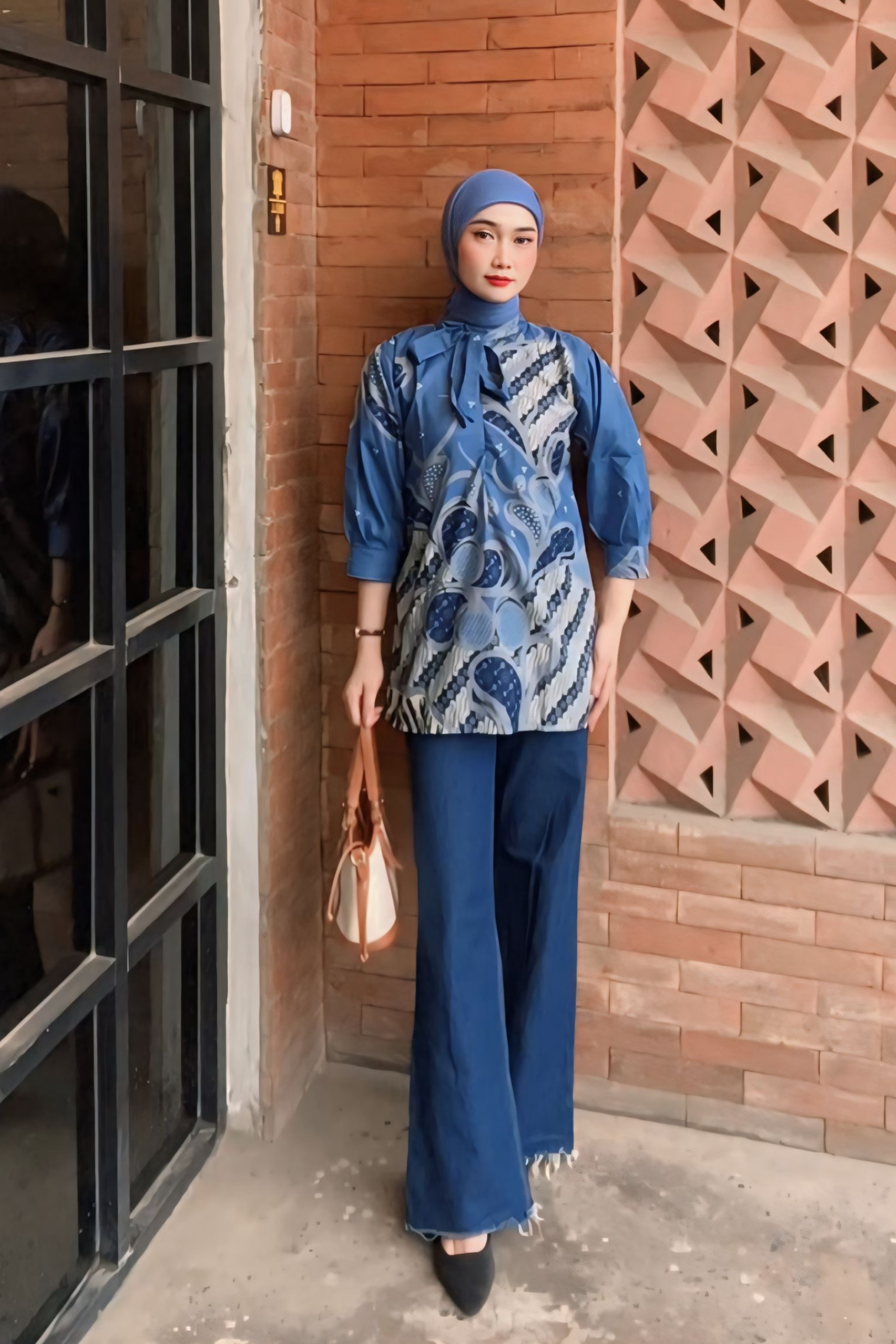 • Atasan Wanita Blouse Batik Motif Mega Mendung Bumi Tali Mop Biru