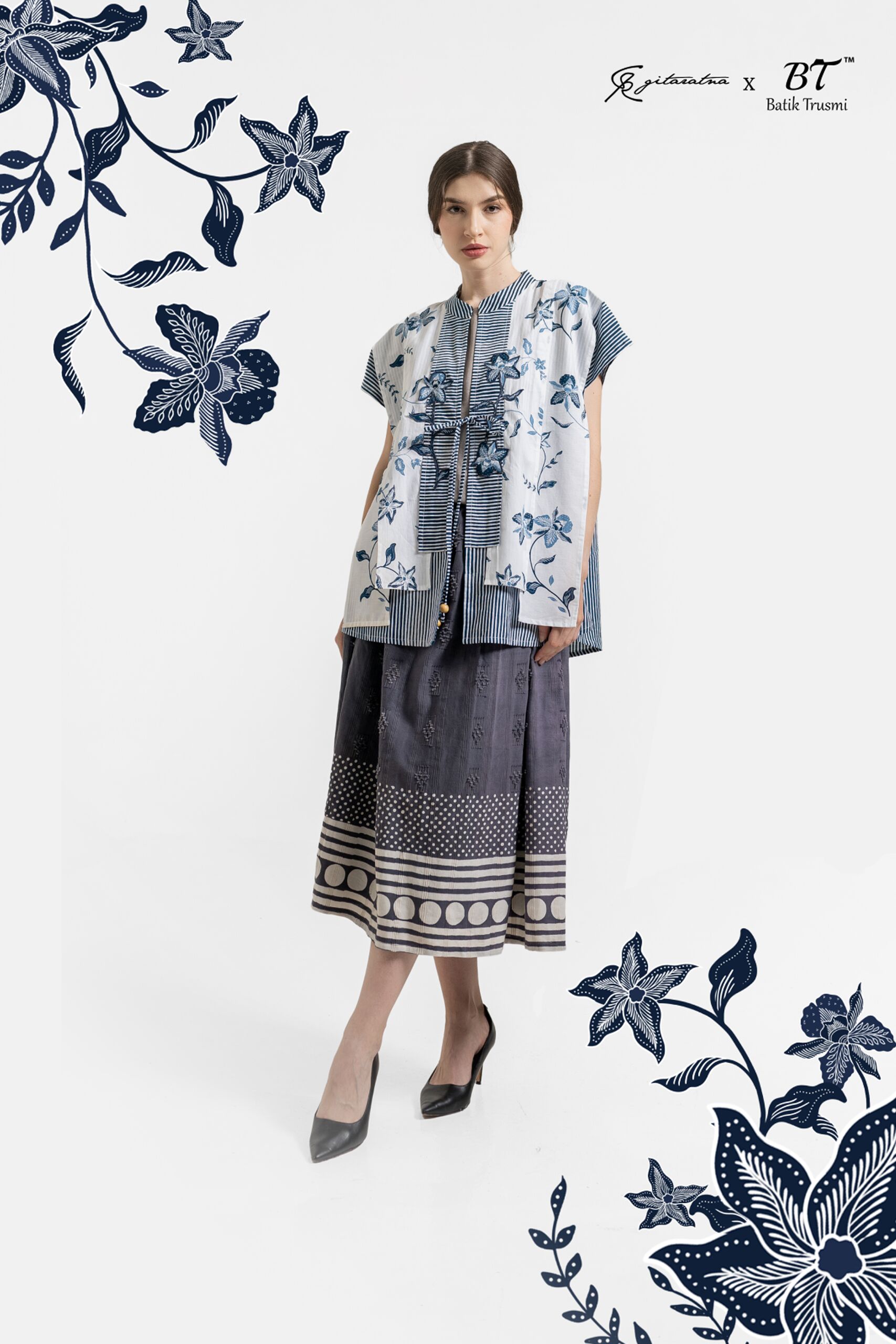 Koleksi eksklusif Batik Trusmi x Gitaratna Series yang menghadirkan perpaduan antara kekayaan budaya batik Cirebon dan sentuhan desain modern yang elegan. Mengusung motif floral Kenanga yang anggun, outer ini melambangkan keharuman, kelembutan, dan keindahan perempuan Indonesia.
